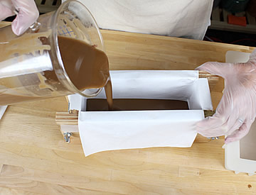 SIX: Fill your wood log mold about 1/3 full with the Cappuccino and Orange Peel Powder Soap. Using the back of a spoon or spatula, pour the second layer with the Yellow colorant. Remember that you’re going to have some soap left over! We’ll take care of that in a moment.